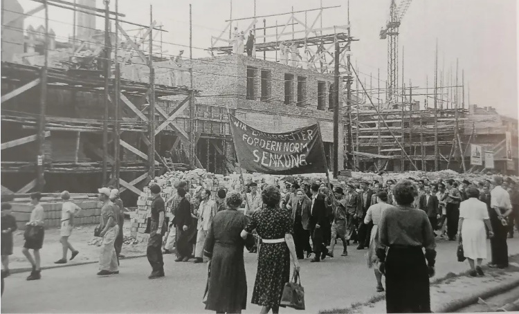 Primeiro marcharam para outras construções. Os colegas de C-Sul os viram chegando de longe. Já estavam embaixo para se juntar a eles antes mesmo que qualquer palavra fosse trocada. O edifício do jornal Neues Deutschland na Küstriner Platz estava coberto de andaimes devido a obras de restauração. Uma testemunha ocular contou: “Subi as escadas com cerca de quinze homens do nosso grupo. ‘Ouçam, vocês concordam com o que está acontecendo?’ E já o primeiro largou a colher de pedreiro. No momento seguinte, as escadas tremeram sob o peso dos trabalhadores. Baldes rolaram de obra abaixo, ferramentas bateram nas tábuas e novamente nosso grupo foi reforçado por cem homens”.